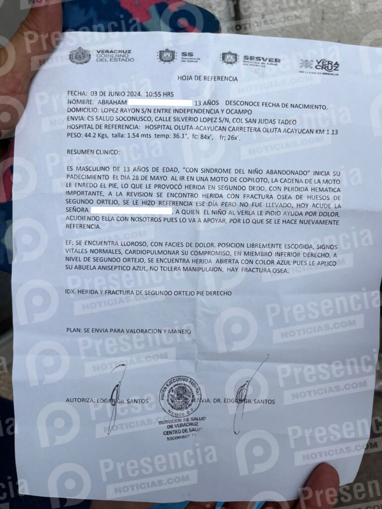 Según el documento que firmó el doctor Edgar Gil Santos del Centro de Salud de Soconusco, al autorizar el traslado del menor de edad al hospital “General Miguel Alemán González” de Oluta – Acayucan, especificó que, el niño presenta el “síndrome del niño abandonado”.