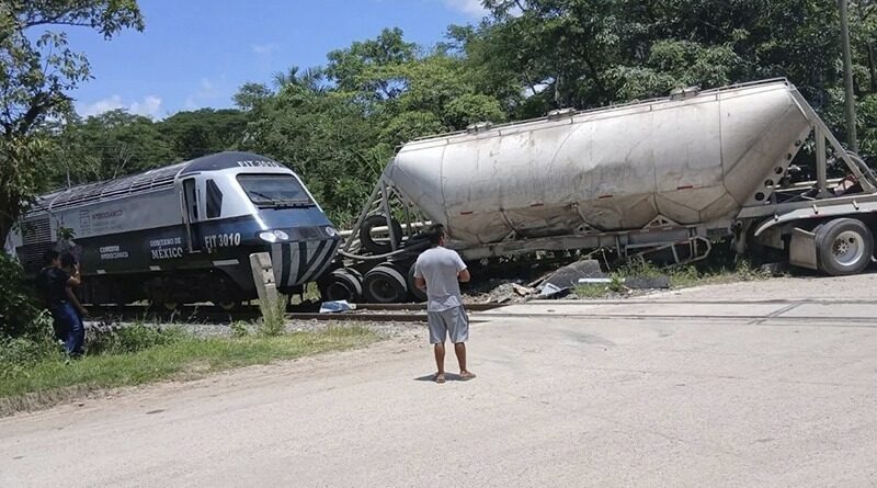 Los reportes señalan que la unidad de carga pesada intentó ganarle el paso al Tren Interoceánico en Macuspana, terminando impactado por el convoy.
