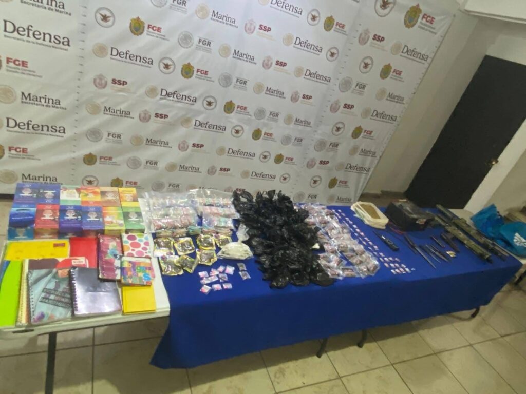 La intervención se llevó a cabo durante patrullajes preventivos en distintas colonias del municipio, donde las fuerzas de seguridad aseguraron una importante cantidad de drogas, dos armas largas, un arma corta, esposas metálicas, armas blancas y casquillos útiles.