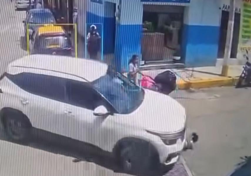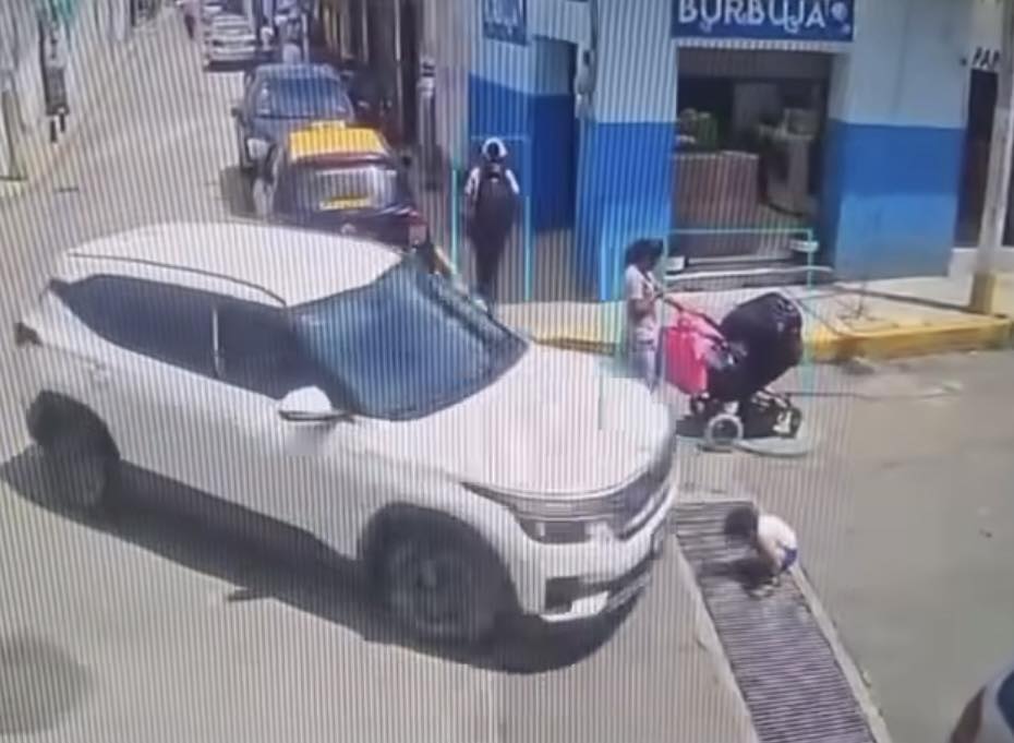 En el video se observa a la madre con una carriola y su hija mayor jugando cerca de una coladera. La niña se agachó y se desplazó hacia la calle sin que la madre lo notara.