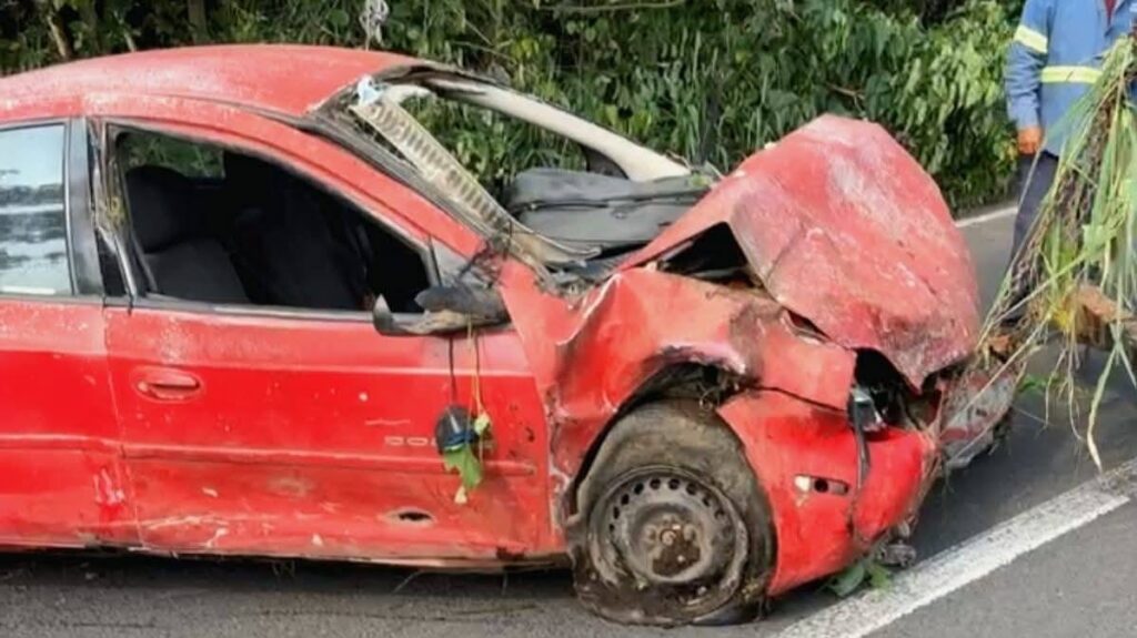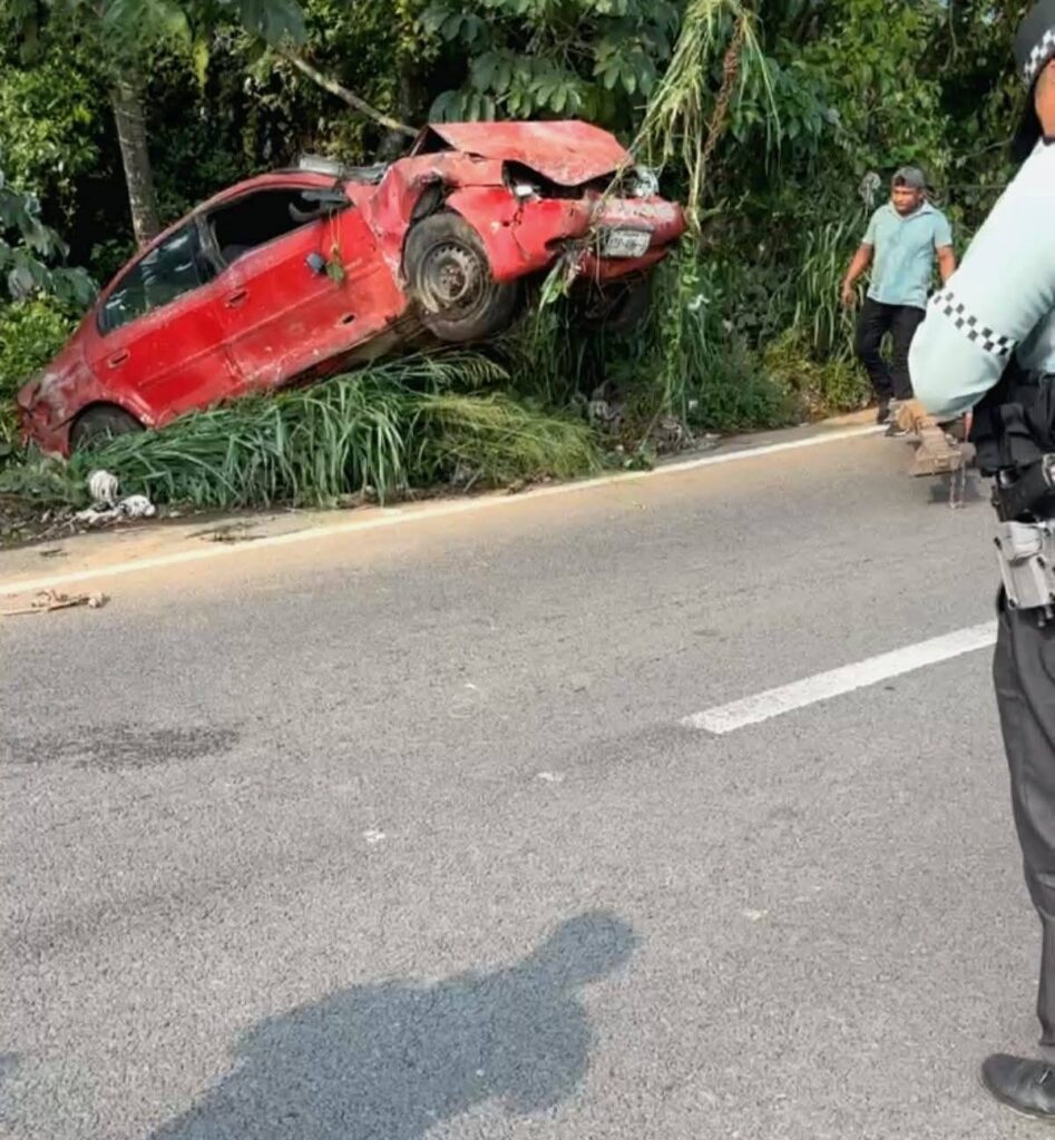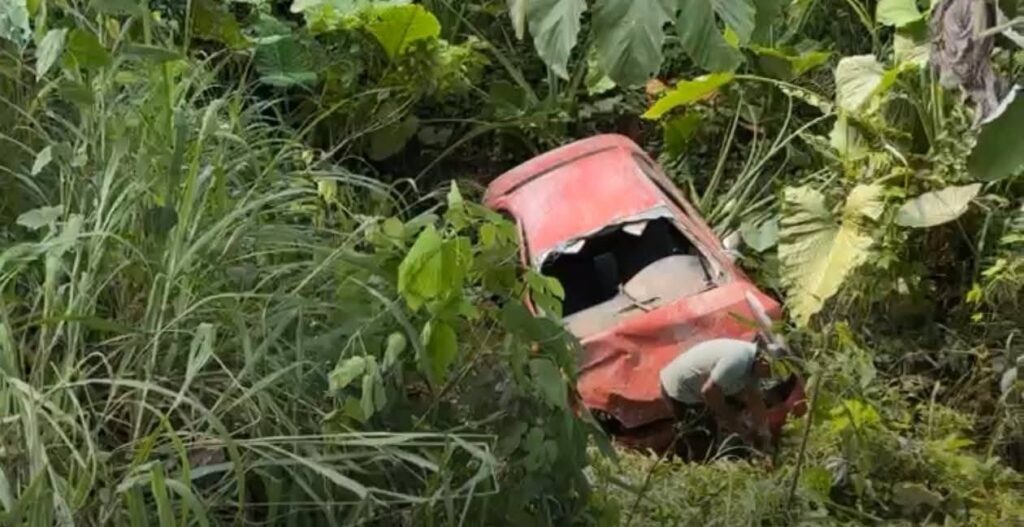 Un automóvil rojo perdió el control, salió de la cinta asfáltica y cayó a un barranco de 5 metros de profundidad.