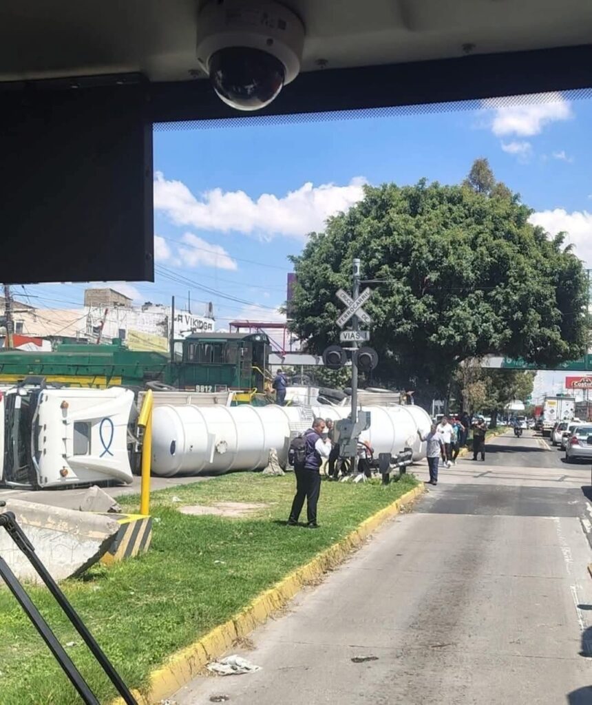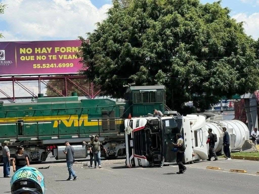Una pipa vacía intentó ganarle el paso a una locomotora en la zona de #Tulpetlac, #Ecatepec. El tren la embistió y la arr4stró varios metros hasta volcarla.