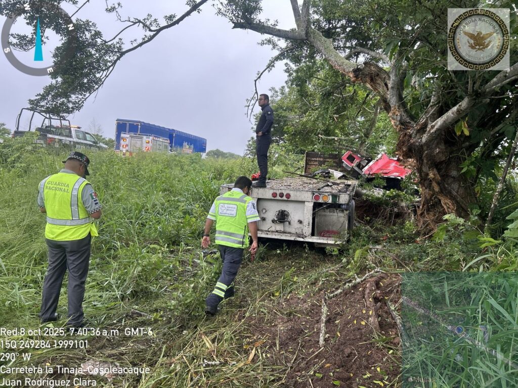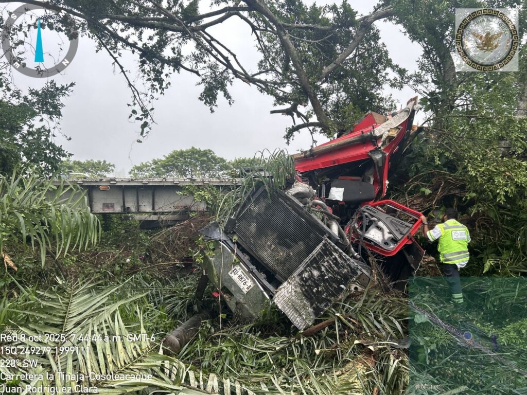 La circulación permanece cerrada con dirección a Cosamaloapan, mientras personal de la Guardia Nacional y CAPUFE realiza maniobras en el área, en espera de la llegada de Servicios Periciales para llevar a cabo las diligencias correspondientes y retirar la unidad siniestrada.