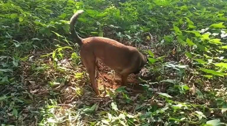 José Azueta, Veracruz. – Un binomio canino busca por todas partes en un predio lleno de hojarascas, pero donde se detiene y olfatea con mayor profundidad, policías y agentes ministeriales entierran una varilla para corroborar si hay restos humanos.
