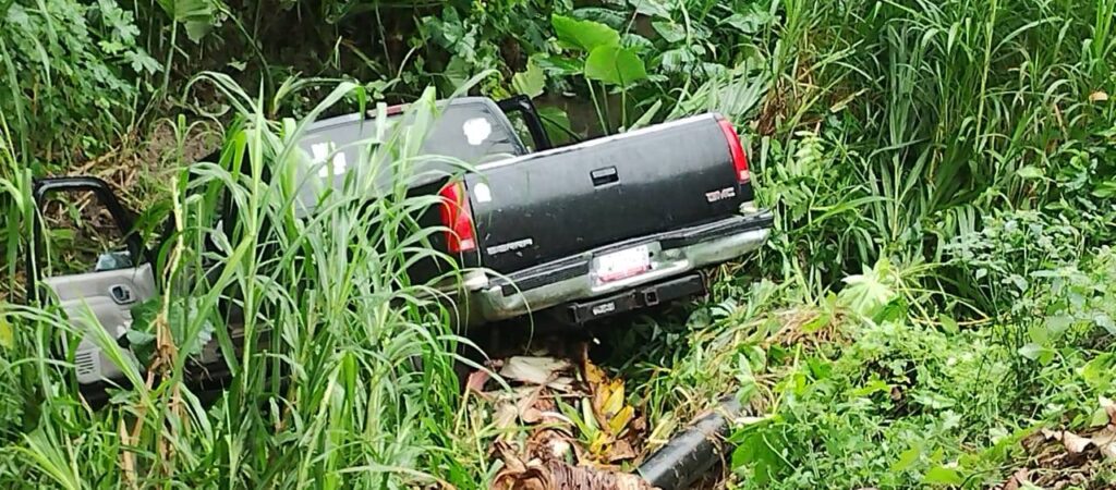 Tratandose de una camioneta GMC Sierra con color negro con placas de circulación LWE-728-B del Estado de Veracruz, cuya conductora proveniente de Gutiérrez Zamora con dirección a Papantla; perdió el control en una curva e impactar contra otra camioneta al invadir el carril, saliendo proyectada a un barranco, cayendo en un arroyo en las inmediaciones de la población; anteriormente mencionada.