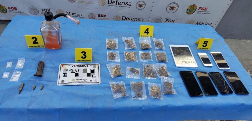 Durante el apoyo a un cateo encabezado por la Fiscalía General del Estado en Emiliano Zapata, se aseguraron 16 bolsas de hierba verde con características similares a la marihuana, cuatro dosis de una sustancia con características del cristal, cargadores, cartuchos útiles, teléfonos móviles, una tableta electrónica y una motocicleta sin reporte de robo.