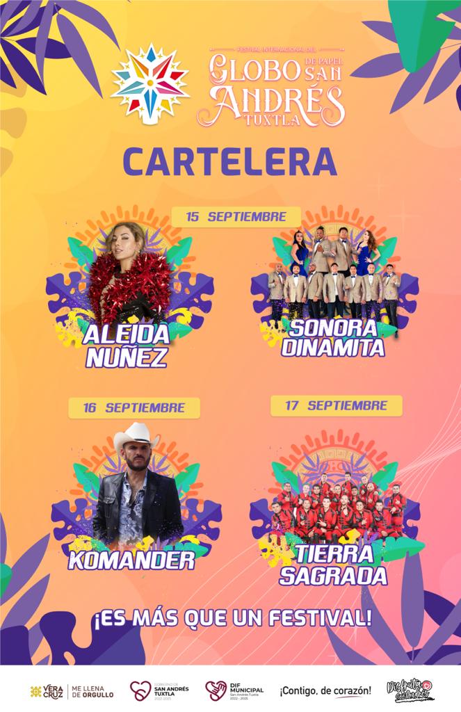 15 de septiembre se presentará Aleida Nuñez y la Sonora Dinamita, el 16 de Septiembre El Komander y para cerrar el festival con broche de oro la presentación del grupo musical Tierra Sagrada.